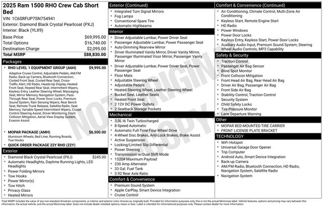 South Fork Chrysler Jeep Dodge Ram is excited to offer this gorgeous-looking 2025 Ram 1500 in Diamond Black Crystal Pearlcoat. This vehicle has passed our comprehensive inspection and comes with the following features: 2025 1500 RHO 12-Way/1-Way Trailer Connector, 14.4" Touchscreen Display, 240 Amp Alternator, 3.92 Rear Axle Ratio, 4G LTE Wi-Fi Hot Spot, Apple CarPlay, Apple CarPlay/Android Auto, Auto Power-Folding Mirrors, Auto-dimming door mirrors, Auto-Dimming Exterior Driver Mirror, Connected Travel & Traffic Services, Connectivity - US/Canada, Driver Power Seat Back Massage, Driver Seat Memory, Driver/Passenger Wrapped Assist Handles, Drowsy Driver Detection, Dual Wireless Charging Pad, Evasive Steer Assist, Exterior Mirrors w/Memory, Flareside Box, Front Passenger Interactive Display, Front Passenger Power Seat Back Massage, Full Length Premium Upgraded Floor Console, Garage door transmitter, Google Android Auto, GPS Navigation, Hands-Free Active Driving Assist System, harman/kardon 19 Speaker Premium Sound, HD Radio, Heads-Up Display, Heated Second Row Seats, Integrated Voice Command w/Bluetooth, Intersection Collision Assist System, Leather Trimmed Bucket Seats, Leather/Carbon Flat-Bottom Steering Wheel, LED CHMSL Lamp, Luxury Front Door Trim Panel, MOPAR Off-Road Style Running Boards, Navigation System, ParkView Rear Back-Up Camera, Power Adjustable Pedals w/Memory, Power Tailgate, Premium Wrapped I/P Bezel, Quick Order Package 22Y RHO, Radio: Uconnect 5 Nav w/14.4" Display, Radio/Driver Seat/Mirrors/Pedals Memory, Rain Sensitive Windshield Wipers, Real Carbon Fiber Interior Accents, Rear 60/40 Folding Split Recline Seat, RHO Level 1 Equipment Group, Smartphone As A Key Capable, Surround View Camera System, Traffic Sign Recognition, USB Host Flip, Ventilated Front Seats, Ventilated Rear Seats, Wheels: 18" x 9" Bead-Lock Aluminum.