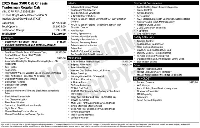 South Fork Chrysler Jeep Dodge Ram is pleased to offer this wonderful 2025 Ram 3500 in Bright White Clearcoat. This vehicle has passed our comprehensive inspection and comes with the following features: 2025 3500 Tradesman Cold Weather Group, Engine Block Heater, MOPAR Winter Front Grille Cover, Quick Order Package 25A Tradesman.