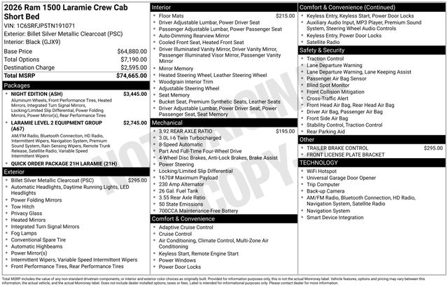 South Fork Chrysler Jeep Dodge Ram is proud to offer this terrific-looking 2026 Ram 1500 in Billet Silver Metallic Clearcoat. This vehicle has passed our comprehensive inspection and comes with the following features: 2026 1500 Laramie 14.4" Touchscreen Display, 4G LTE Wi-Fi Hot Spot, Accent Color Door Handles, Accent Color Premium Power Mirrors, Accent Color Tailgate Handle, Anti-Spin Differential Rear Axle, Auto Power-Folding Mirrors, Auto-Dimming Exterior Driver Mirror, Black Exterior Truck Badging, Black Headlamp Bezels, Black Interior Accents, Black Painted Exterior Mirrors Caps, Black Tail Lamp Bezels, Body Color Front Bumper, Cluster 12" TFT Color Display, Connectivity - US/Canada, Convex Wide-Angle Exterior Mirror Insert, Exterior Mirrors Approach Lamps, Exterior Mirrors Courtesy Lamps, Front Passenger Interactive Display, GPS Navigation, Grille Surround 3 Black Texture 2 Black, Integrated Center Stack Radio, Laramie Level 2 Equipment Group, Navigation System, Night Edition, Pirelli Brand Tires, Power Tailgate, Proximity Approach/Departure Lamps, Quick Order Package 21H Laramie, Rain Sensitive Windshield Wipers, RAM Grille Badge - Black, SiriusXM Radio Service, Sport Performance Hood, USB Host Flip, Wheels: 22" x 9" Forged Aluminum.