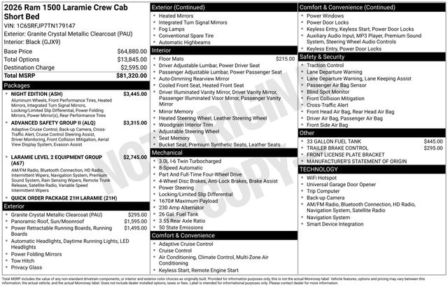 Standout features include the Night Edition package, which adds a bold, blacked-out aesthetic with details like black headlamp bezels, 22-inch forged aluminum wheels, and a sport performance hood. The Advanced Safety Group II and Laramie Level 2 Equipment Group further enhance your driving confidence with advanced driver-assist technologies, a 14.4-inch touchscreen display, and a premium harman/kardon sound system.