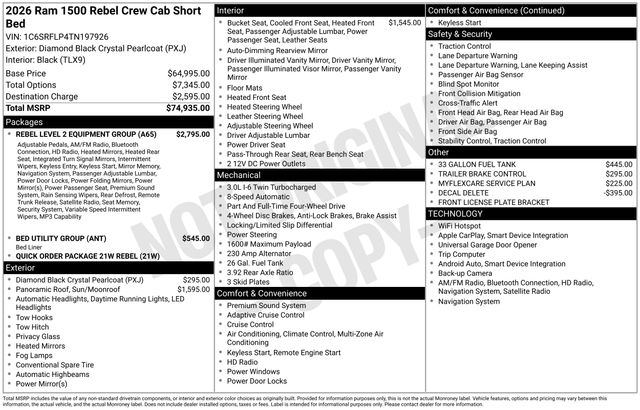 Whether you're tackling the great outdoors, hauling heavy loads, or simply enjoying the daily commute, the 2026 Ram 1500 Rebel is the ultimate companion. Experience the perfect blend of power, capability, and premium features that will elevate your driving experience. Visit our showroom today and let us demonstrate why this exceptional truck should be your next automotive partner. Art is for illustration purposes only. Not responsible for errors or omissions. All vehicle's are plus tax, title, license, official fees, equipment and destination fees.. Price includes: $1000 - 2026 National Bonus Cash . Exp. 03/31/2026 $1000 - 2026 Southwest BC State of Texas Regional Bonus Cash . Exp. 03/31/2026 $3500 - 2026 National Retail Consumer Cash . Exp. 03/31/2026