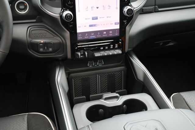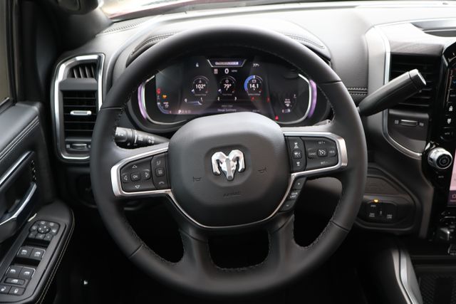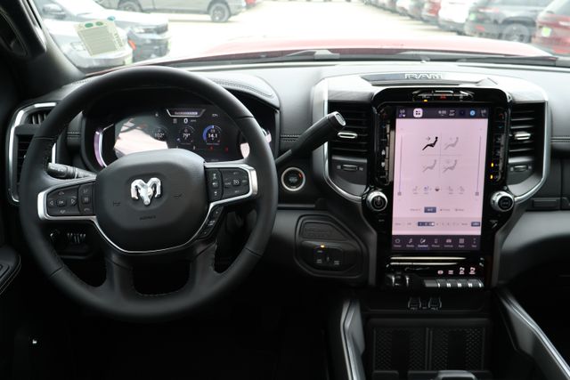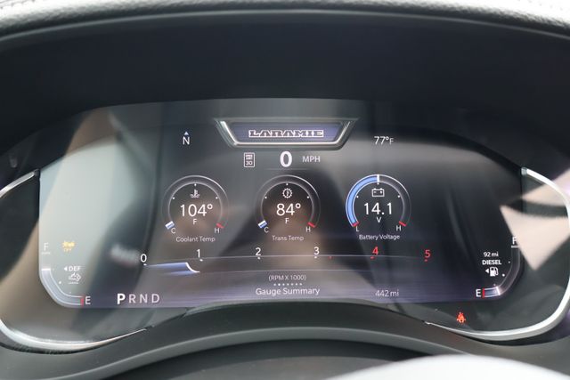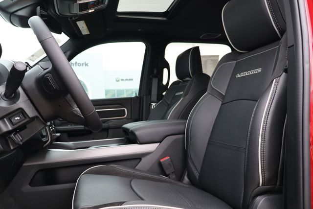 Slip behind the wheel of the Laramie's plush leather-trimmed bucket seats and you'll be surrounded by cutting-edge technology, including the Uconnect 5 Navigation system with a 12-inch display, wireless charging pads, and a power sunroof that floods the cabin with natural light.