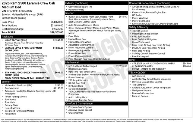 Elevate your driving experience with this exceptional 2026 Ram 2500 Laramie. Boasting a powerful 6.7L I6 Diesel Turbocharged engine, this truck is built to tackle any challenge with ease. Outfitted with the Night Edition and Laramie Level 1 Plus Equipment Group, this Ram 2500 is a true standout, blending rugged capability with refined style.