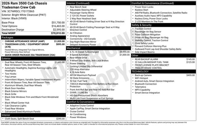 South Fork Chrysler Jeep Dodge Ram is pleased to offer this good-looking 2026 Ram 3500 in Bright White Clearcoat. This vehicle has passed our comprehensive inspection and comes with the following features: 2026 3500 Tradesman 11.50" Dual Wheels Rear Axle, 22 Gallon Midship Fuel Tank, 6000# Front Axle with Hub Extension, Black Exterior Mirrors, Black Power Heated Fold Telescope Mirrors, Black Wheel Center Hub, Bright Front Bumper, Center Hub, Chrome Appearance Group, Chrome Grille Surround, Dual Rear Wheels, Exterior Mirrors Courtesy Lamps, Exterior Mirrors with Heating Element, Exterior Mirrors with Supplemental Signals, Manual Folding Exterior Mirrors, Matte Black Mesh Grille with Chrome, Mirror Running Lights, Nexen Brand Tires, Power Adjust Mirrors, Power-Adjustable Convex Aux Mirrors, Quick Order Package 25A Tradesman, Rear Window Defroster, Tradesman Level 1 Equipment Group, Trailer Brake Control, Trailer Light Check, Wheels: 17" x 6.0" Black Painted Steel.