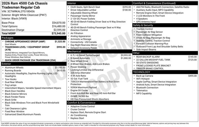 South Fork Chrysler Jeep Dodge Ram is very proud to offer this stunning 2026 Ram 4500HD in Bright White Clearcoat. This vehicle has passed our comprehensive inspection and comes with the following features: 2026 4500HD Tradesman 19.5" x 6.0" Steel Wheels, 22 Gallon Midship Fuel Tank, 52 and 22 Gallon Dual Fuel Tanks, Black Exterior Mirrors, Bright Front Bumper, Center Hub, Chrome Appearance Group, Chrome Grille Surround, Dual rear wheels, Exterior Mirrors Courtesy Lamps, Exterior Mirrors with Heating Element, Exterior Mirrors with Supplemental Signals, Front 1-Touch Down Power Windows, Manual Folding Exterior Mirrors, Manuarl Telescoping Mirrors, Matte Black Mesh Grille with Chrome, Mirror Power Heat Fold Telescope Black, Mirror Running Lights, Power Adjust Mirrors, Power-Adjustable Convex Aux Mirrors, Quick Order Package 25A Tradesman, Rear Window Defroster, Remote Keyless Entry, Speed Sensitive Power Locks, Tradesman Level 1 Equipment Group, Trailer Brake Control, Trailer Light Check, Upgraded Door Trim Panel.