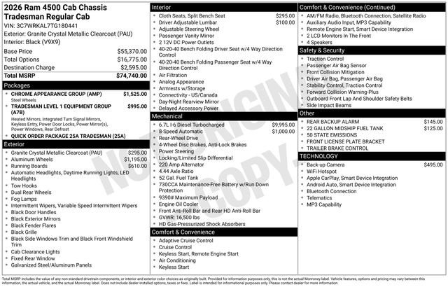 South Fork Chrysler Jeep Dodge Ram is excited to offer this outstanding-looking 2026 Ram 4500HD in Granite Crystal Metallic Clearcoat. This vehicle has passed our comprehensive inspection and comes with the following features: 2026 4500HD Tradesman 19.5" x 6.0" Steel Wheels, 22 Gallon Midship Fuel Tank, Black Exterior Mirrors, Bright Front Bumper, Center Hub, Chrome Appearance Group, Chrome Grille Surround, Dual rear wheels, Exterior Mirrors Courtesy Lamps, Exterior Mirrors with Heating Element, Exterior Mirrors with Supplemental Signals, Front 1-Touch Down Power Windows, Manual Folding Exterior Mirrors, Manuarl Telescoping Mirrors, Matte Black Mesh Grille with Chrome, Mirror Power Heat Fold Telescope Black, Mirror Running Lights, Power Adjust Mirrors, Power-Adjustable Convex Aux Mirrors, Quick Order Package 25A Tradesman, Rear Window Defroster, Remote Keyless Entry, Speed Sensitive Power Locks, Tradesman Level 1 Equipment Group, Trailer Brake Control, Trailer Light Check, Upgraded Door Trim Panel.