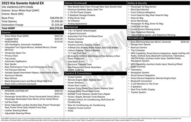 Discover the perfect blend of power and efficiency in the 2023 Kia Sorento Hybrid EX. This exceptional SUV combines a robust 1.6L I4 DGI Hybrid Turbocharged engine with a 6-Speed Automatic transmission and All-Wheel Drive, delivering an impressive 36 city MPG and 33 highway MPG.