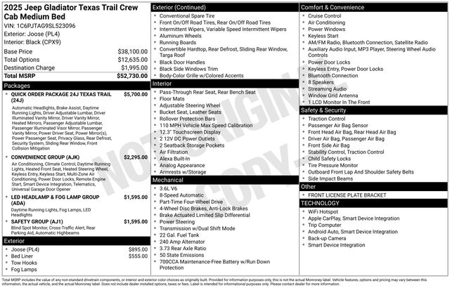 Designed with the adventurer in mind, the 2025 Jeep Gladiator Texas Trail is a true off-road champion. Its rugged good looks, exceptional capabilities, and premium amenities make it the perfect choice for those who demand the very best. Experience the thrill of the open road and the freedom of the trail in this remarkable Jeep. Schedule a test drive today and discover the difference for yourself.